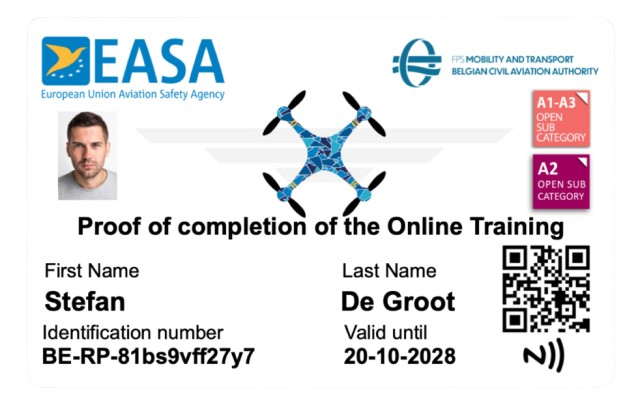 Custom design Belgische Drone Pas Standaard Categorie A1/A3 – A2 met vlag met NFC & QR Code